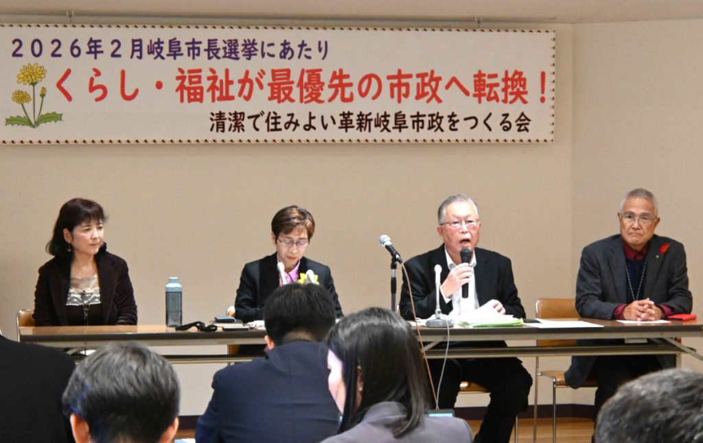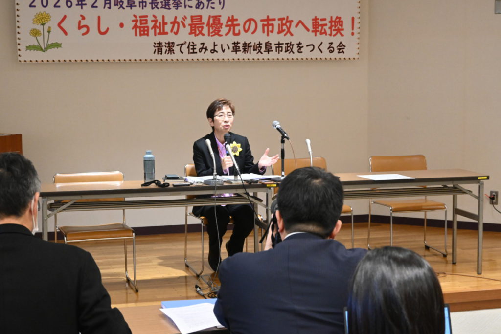 来年2月23日の任期満了に伴う岐阜市長選(2026年1月25日告示、2月1日投票)で、市民団体などでつくる「清潔で住みよい革新岐阜市政をつくる会(革新市政の会)」は12日、元県議で社会福祉法人理事長の大須賀しづか氏(66)=無所属新・日本共産党推薦=を擁立してたたかうと記者会見しました。